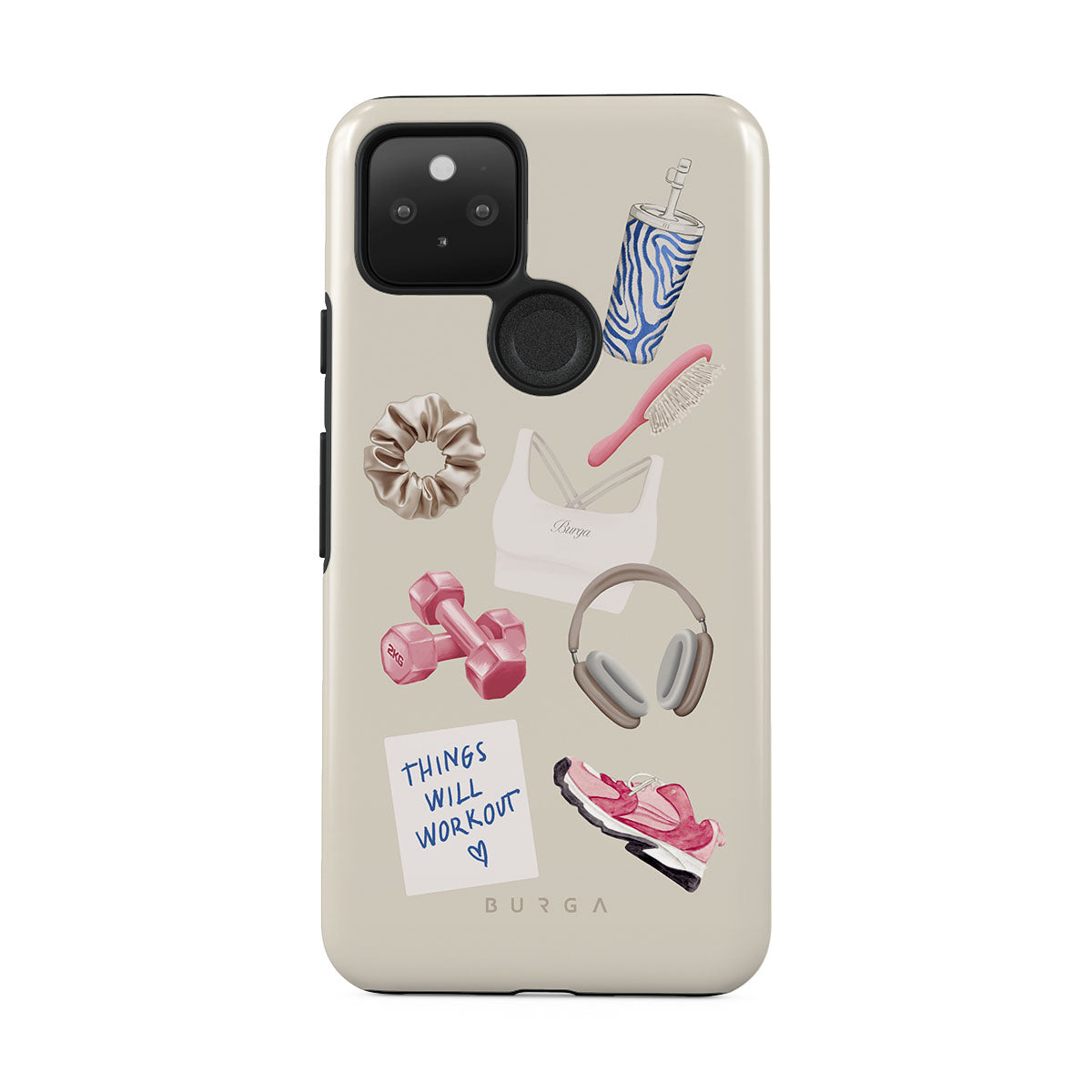 This design features: dumbbells, headphones, tumbler, hairbrush, pink trainers, sports bra, crunchie, "Things Will Work Out" sticky note