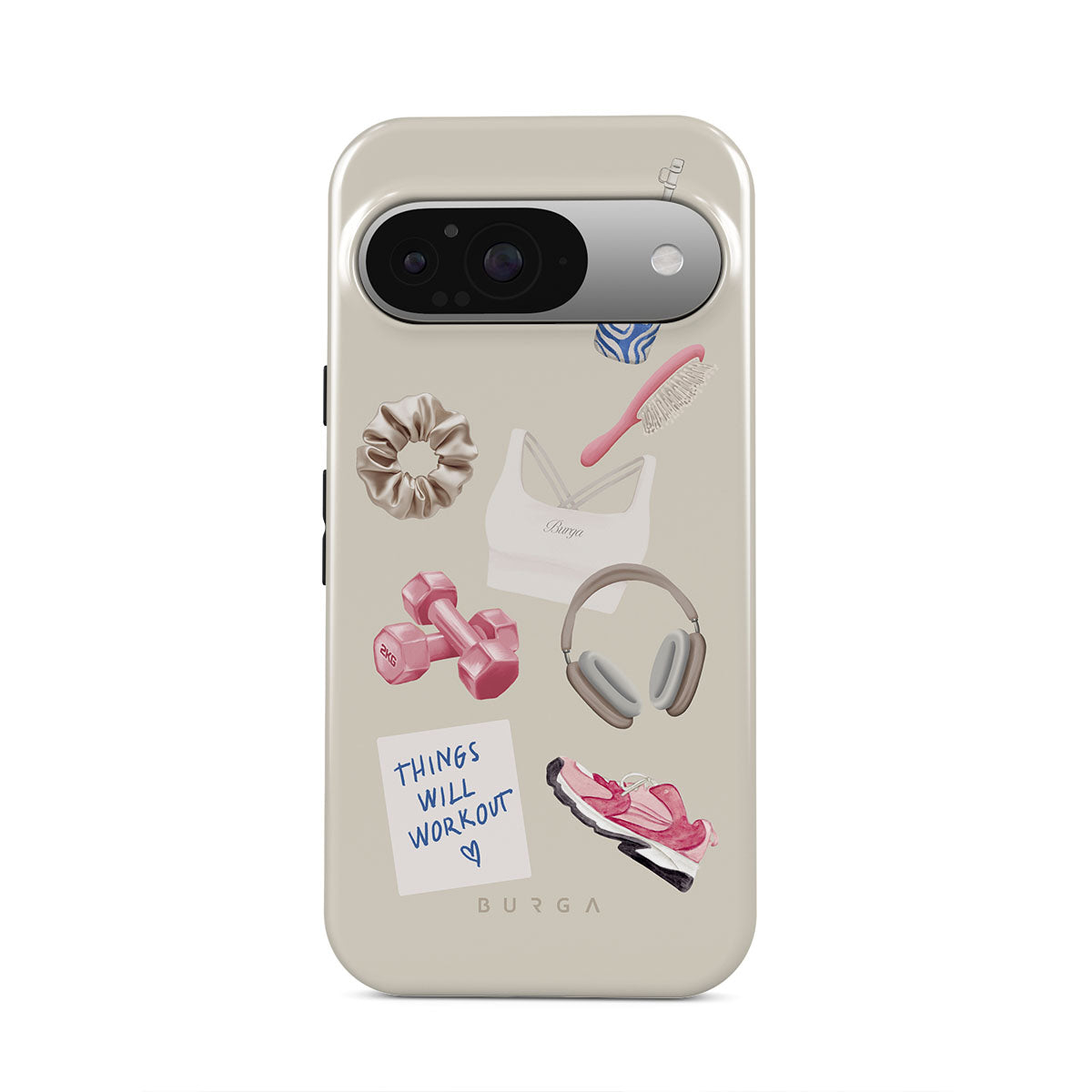 This design features: dumbbells, headphones, tumbler, hairbrush, pink trainers, sports bra, crunchie, "Things Will Work Out" sticky note