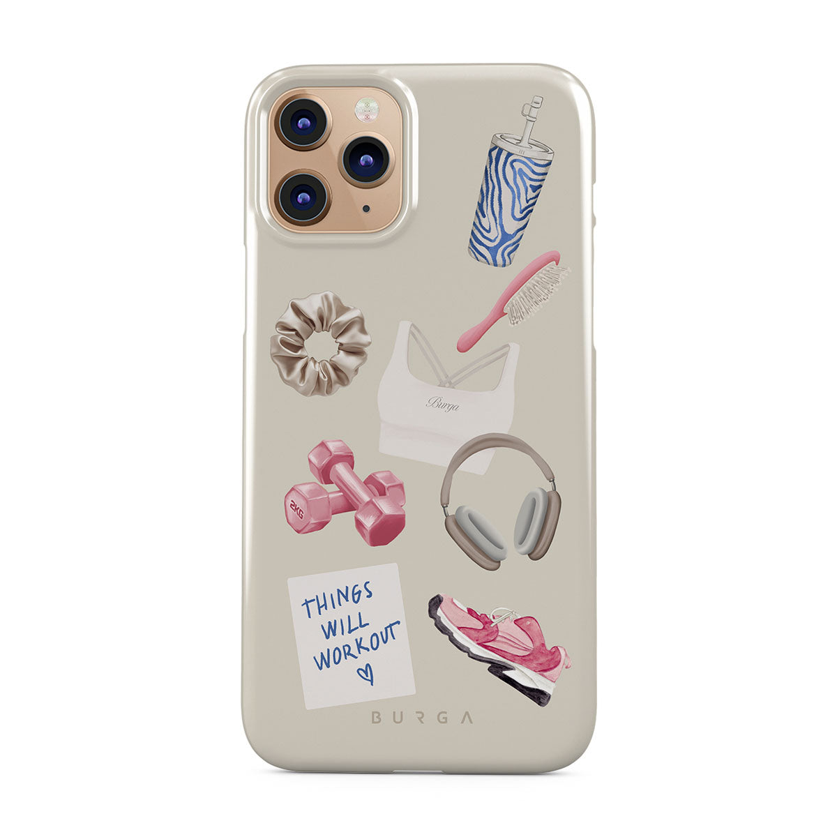 This design features: dumbbells, headphones, tumbler, hairbrush, pink trainers, sports bra, crunchie, "Things Will Work Out" sticky note