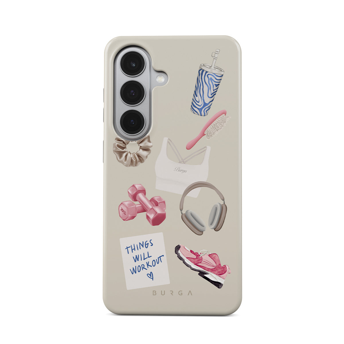 This design features: dumbbells, headphones, tumbler, hairbrush, pink trainers, sports bra, crunchie, "Things Will Work Out" sticky note