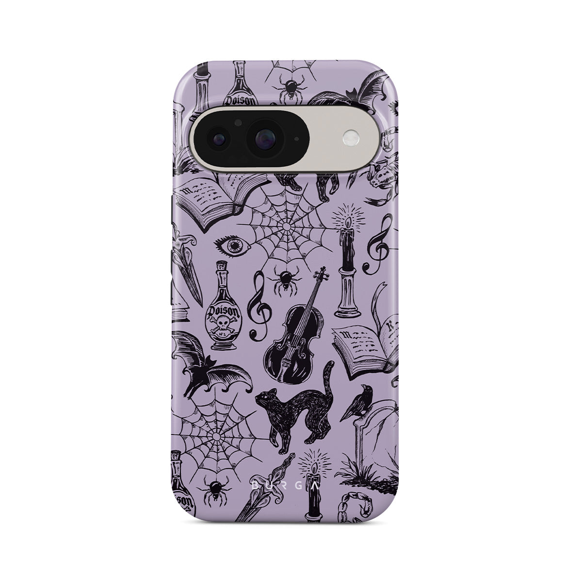 This design features: gothic doodles, mystical elements, spiders, spiderweb, cat, violin, eye, candle, dagger, book, bat, crow, scorpion