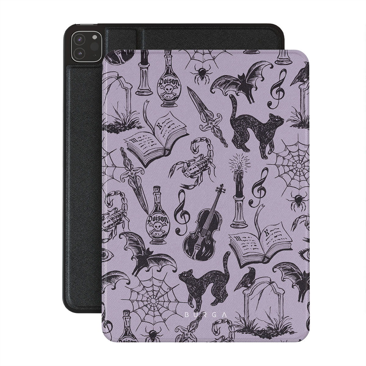 This design features: gothic doodles, mystical elements, spiders, spiderweb, cat, violin, eye, candle, dagger, book, bat, crow, scorpion