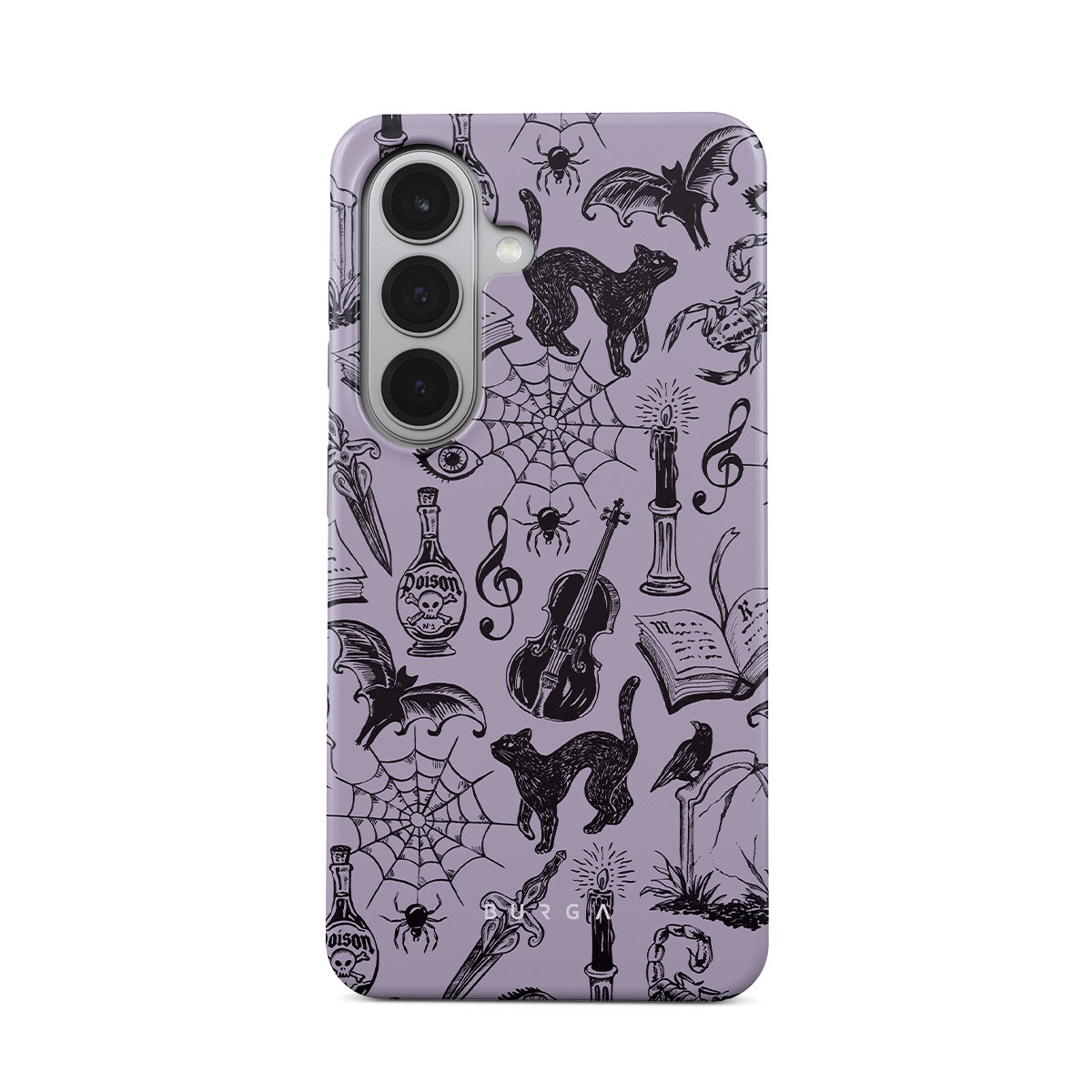 This design features: gothic doodles, mystical elements, spiders, spiderweb, cat, violin, eye, candle, dagger, book, bat, crow, scorpion