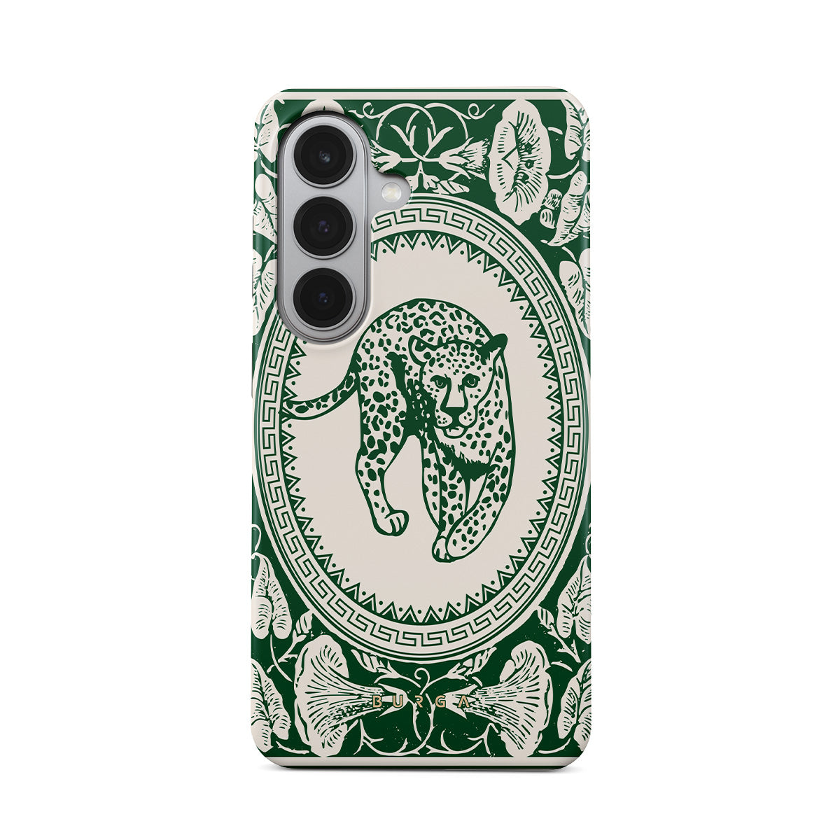 Our Antique Samsung Galaxy S26 phone case design—a nude canvas kissed by refined green contours, painting an eternal saga of elegance. Enthroned at its center is a regal leopard embraced by a tender floral caress. A nod to timeless opulence, this design captures the essence of vintage prestige.