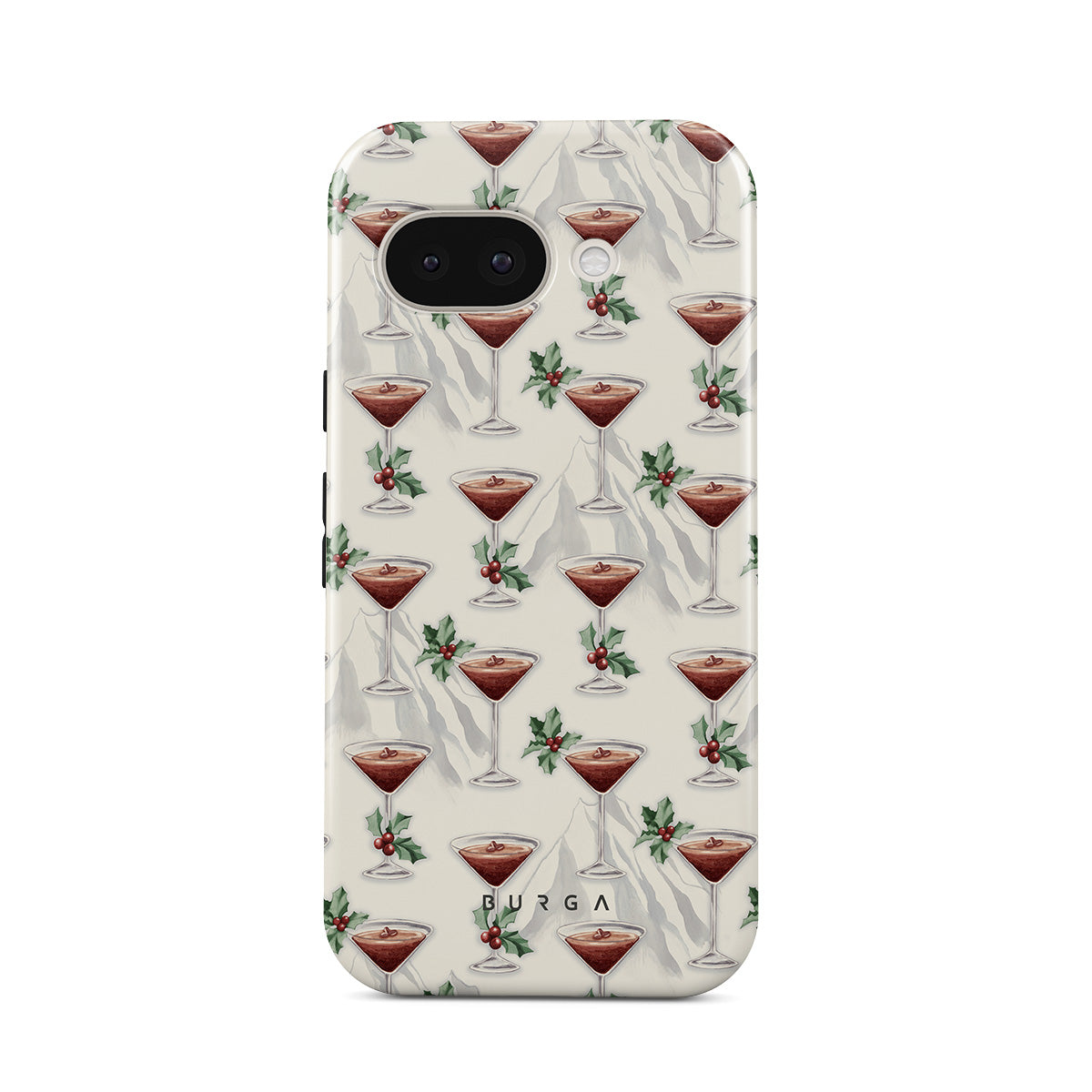 This design features: cocktail glasses, martinis, holly leaves