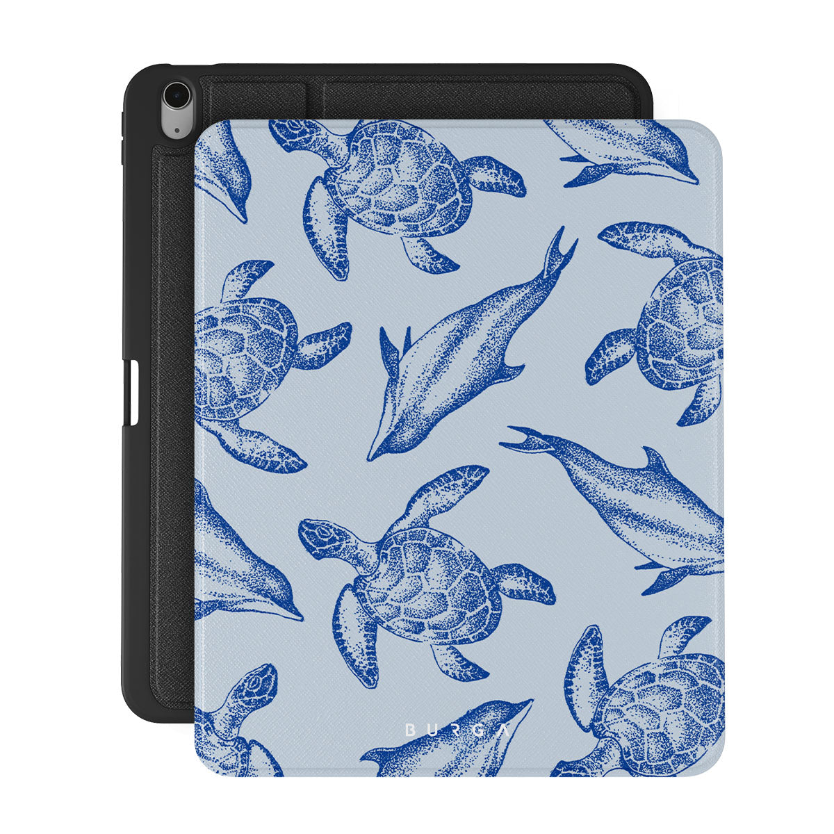 A beautiful design featuring lively turtles and dolphins playfully dancing in serene light blue water. Dive into the ocean's rhythm with our Aquatic Dance iPad Air 13 (7th/6th Gen) folio case.