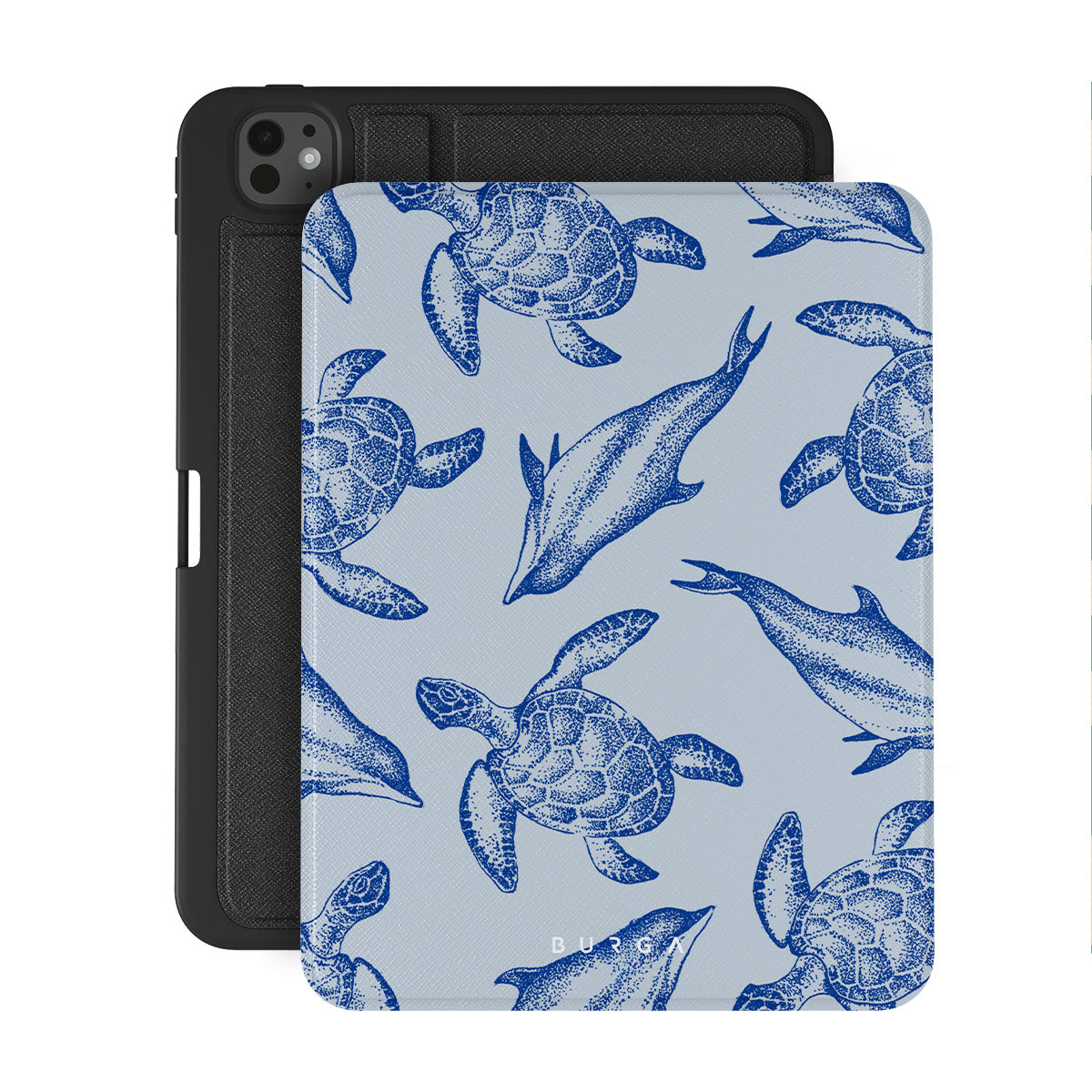 A beautiful design featuring lively turtles and dolphins playfully dancing in serene light blue water. Dive into the ocean's rhythm with our Aquatic Dance iPad Pro 11 (8th/7th Gen) folio case.