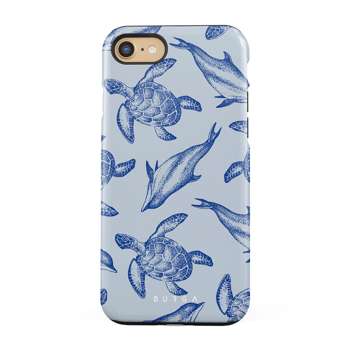 A beautiful design featuring lively turtles and dolphins playfully dancing in serene light blue water. Dive into the ocean's rhythm with our Aquatic Dance iPhone SE (2022) case.
