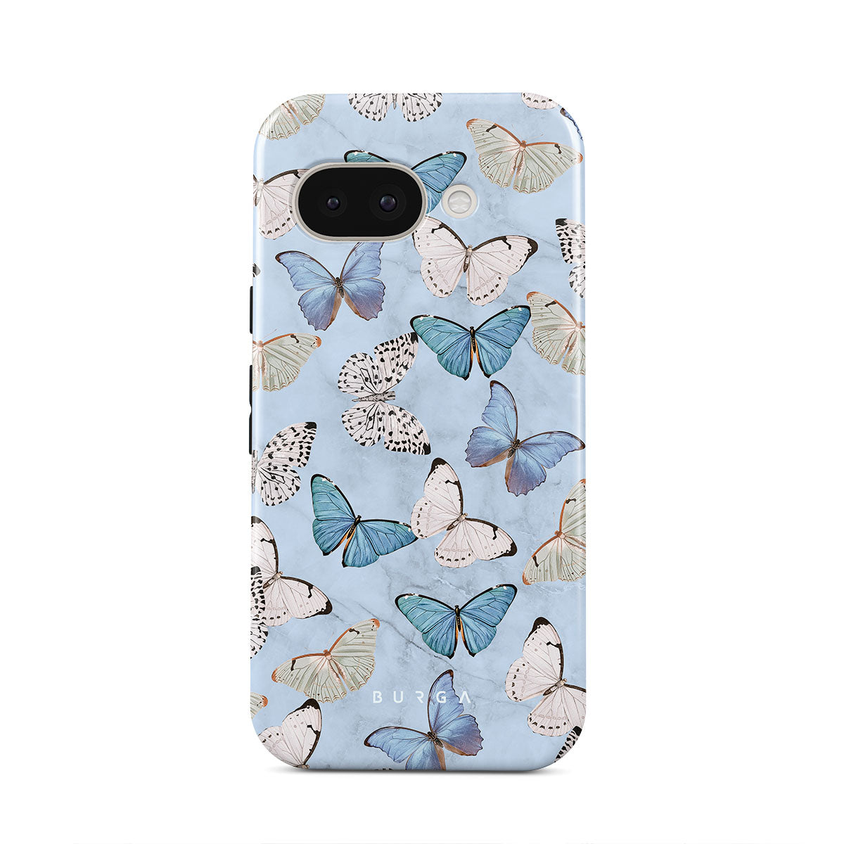 Pastel blue and a playful pattern of summery butterflies create a dreamy combination in our Google Pixel 9a phone case. Carry the feeling of the butterflies in your stomach while protecting your phone from any dangers, as the hard-shell case will keep it sound and safe.