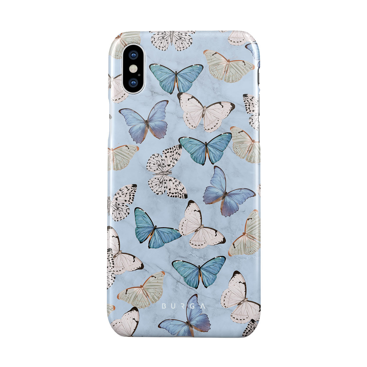 Pastel blue and a playful pattern of summery butterflies create a dreamy combination in our iPhone XS Max phone case. Carry the feeling of the butterflies in your stomach while protecting your phone from any dangers, as the hard-shell case will keep it sound and safe.