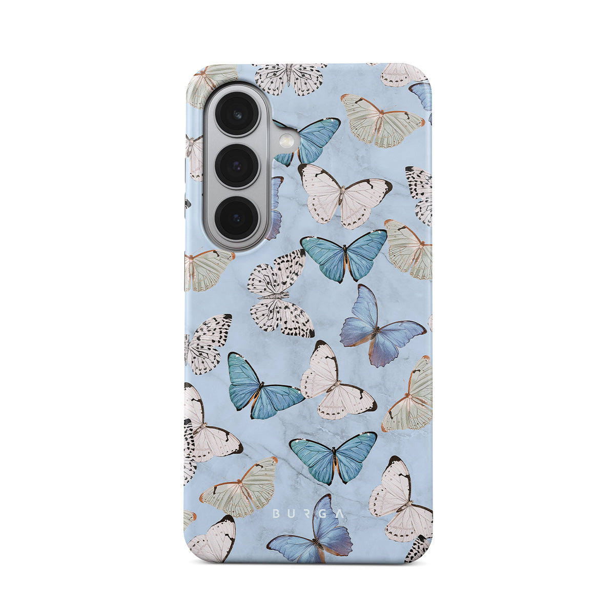 Pastel blue and a playful pattern of summery butterflies create a dreamy combination in our Samsung Galaxy S26 Plus phone case. Carry the feeling of the butterflies in your stomach while protecting your phone from any dangers, as the hard-shell case will keep it sound and safe.