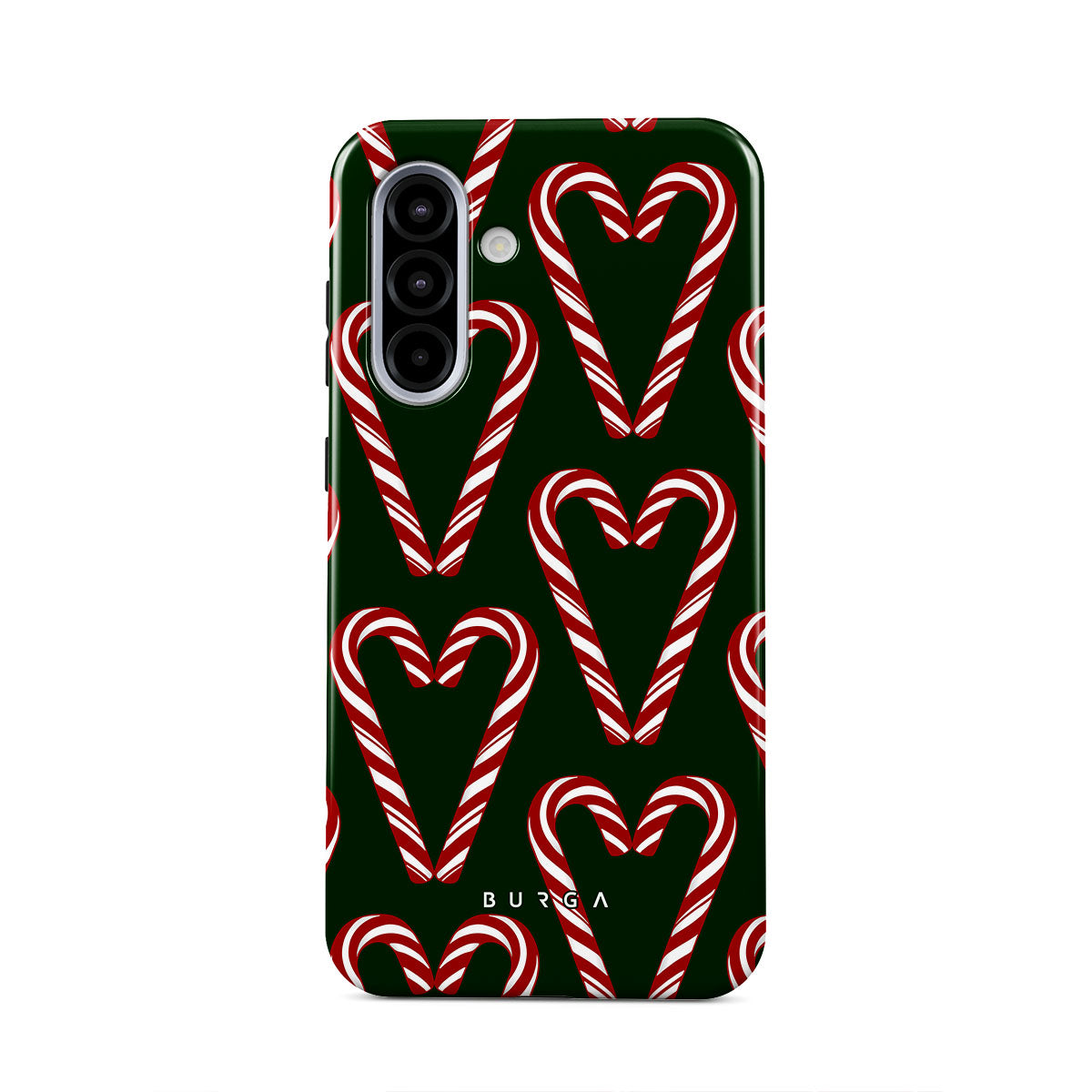Vibrant and playful, our Candy Cane Samsung Galaxy A36 5G Case phone case design showcases candy cane heart motifs against a dark green background—a delightful choice for those who love a touch of whimsy and nostalgia.