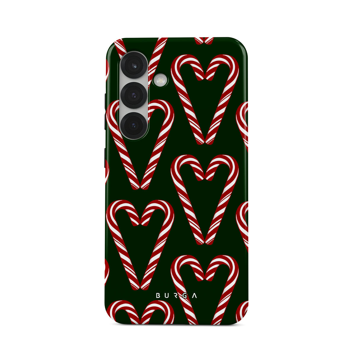 Vibrant and playful, our Candy Cane Samsung Galaxy S25 Case phone case design showcases candy cane heart motifs against a dark green background—a delightful choice for those who love a touch of whimsy and nostalgia.