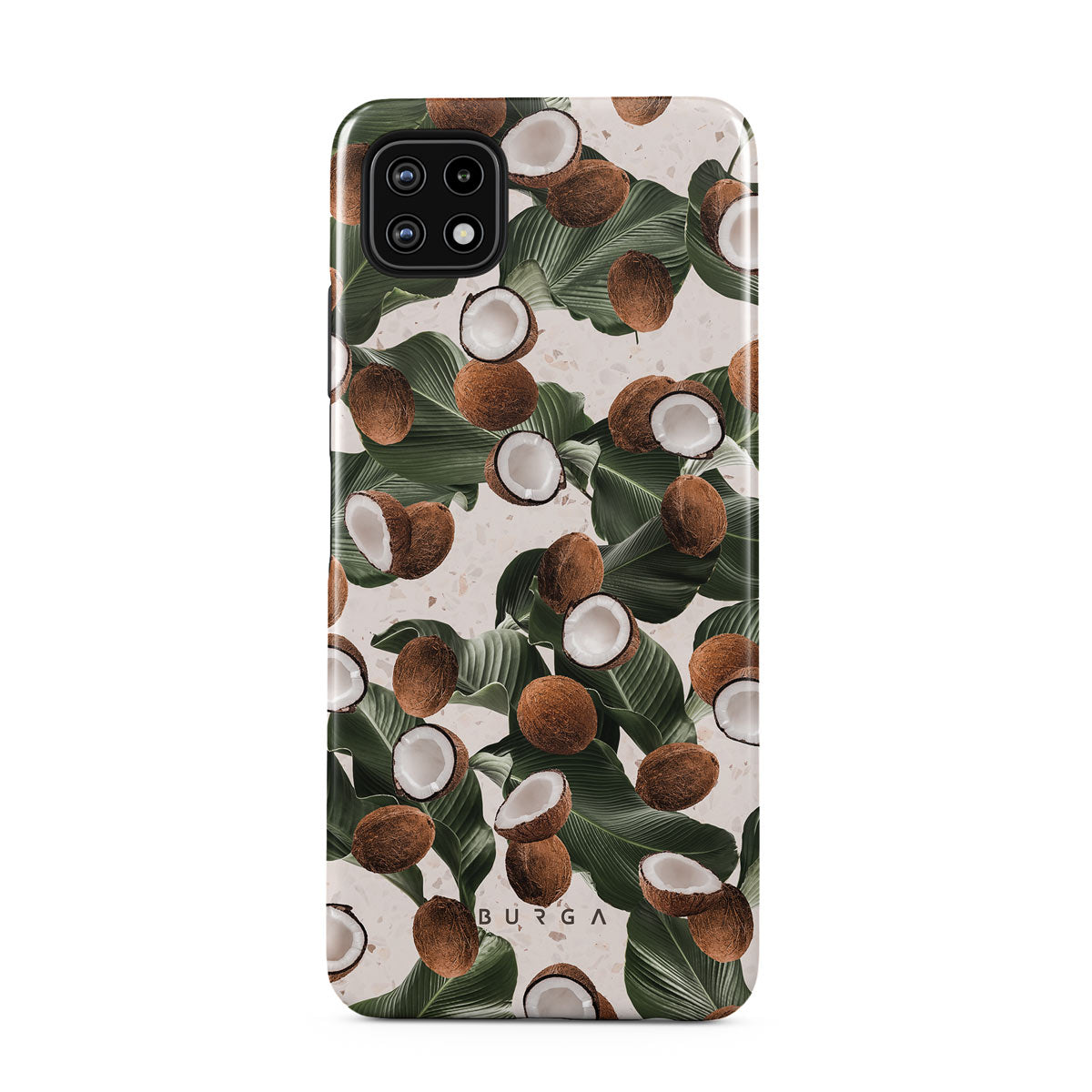 Coconut Crush Samsung Galaxy A22 5G phone case showcases a soft creme color design with a playful addition of coconuts on top. The unexpected design duo will add a touch of tropical playfulness to your style while offering heavy-duty protection for your cell phone.