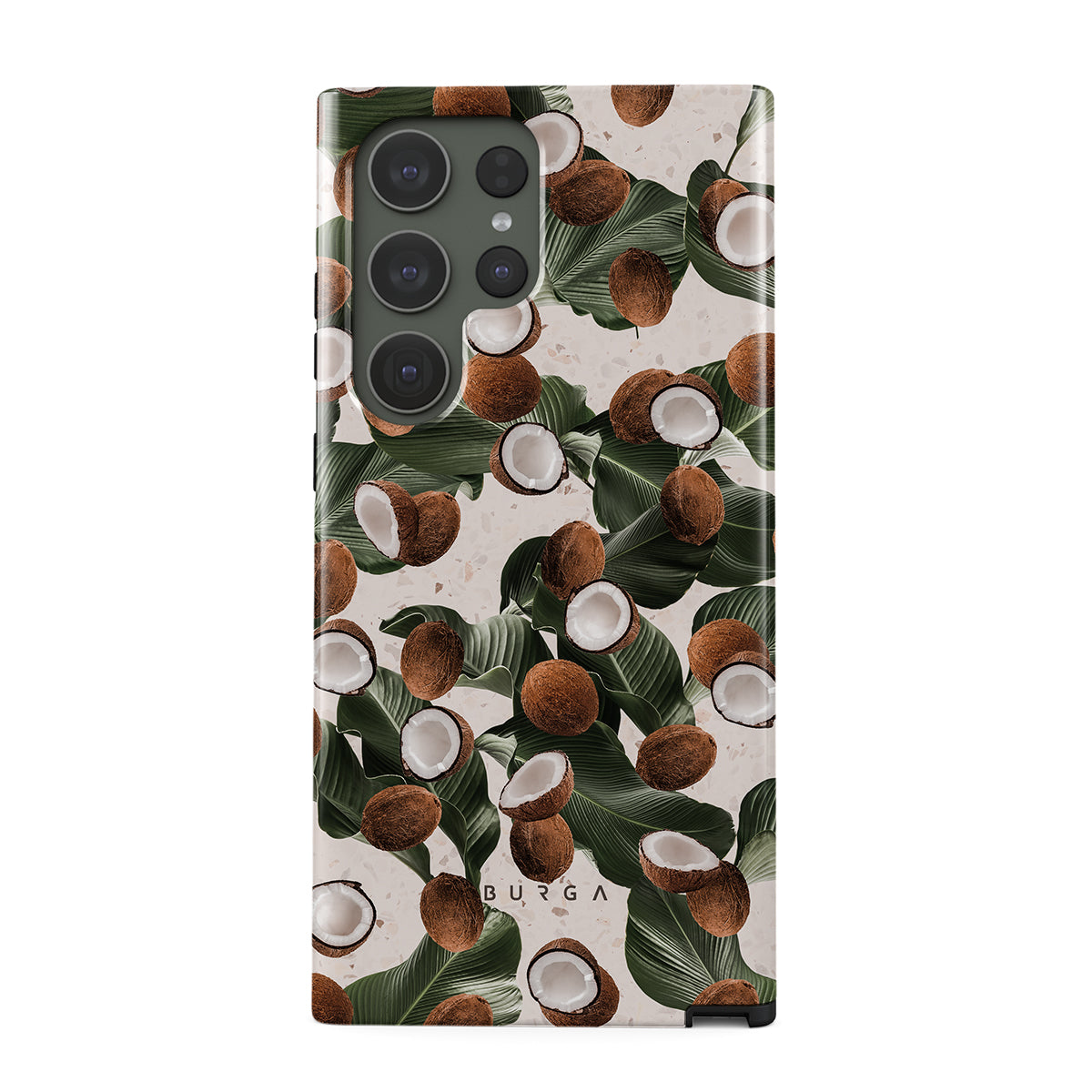 Coconut Crush Samsung Galaxy S23 Ultra phone case showcases a soft creme color design with a playful addition of coconuts on top. The unexpected design duo will add a touch of tropical playfulness to your style while offering heavy-duty protection for your cell phone.