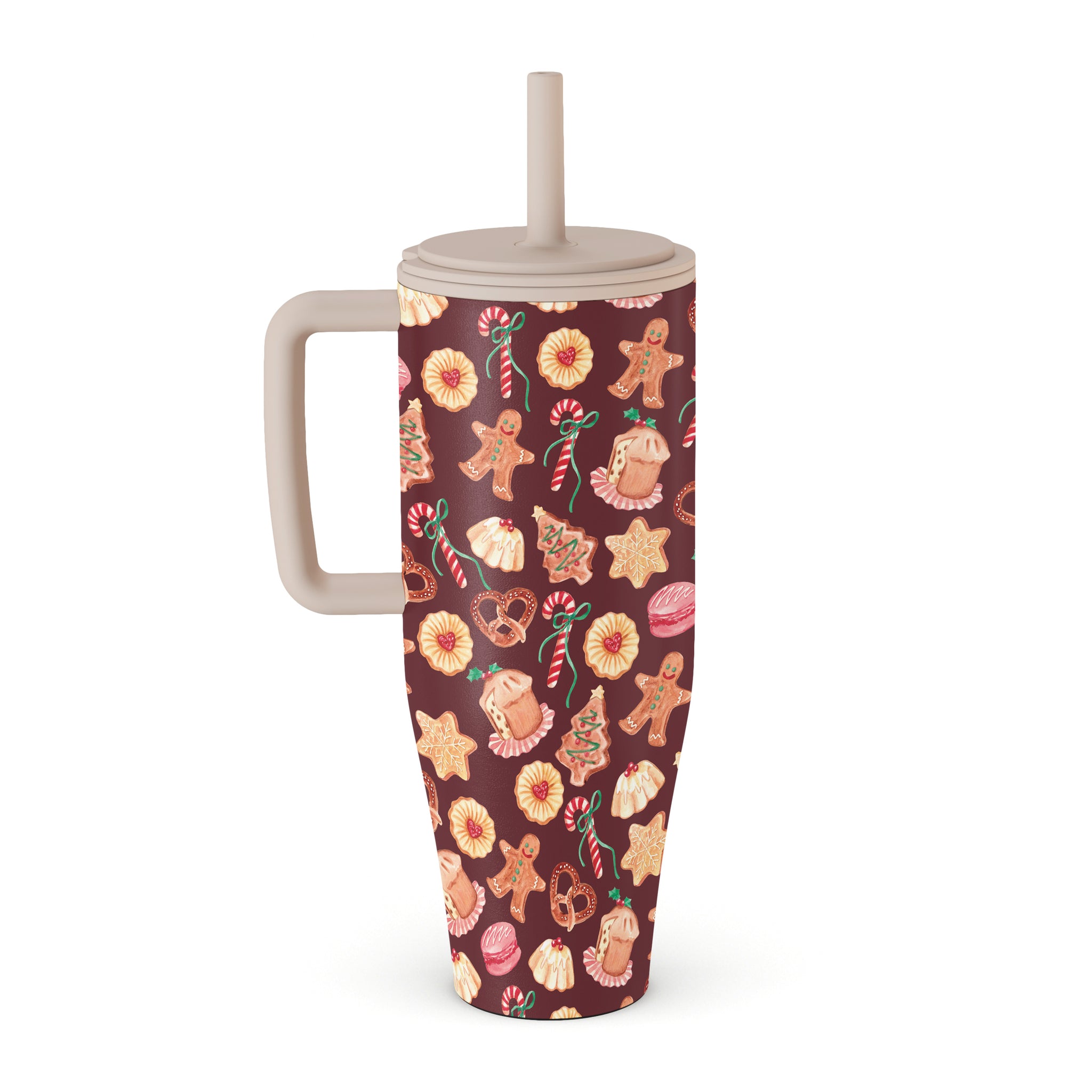 This design features: Christmas cookies, gingerbread men, candy canes, peppermint candies, festive sweets, burgundy red background