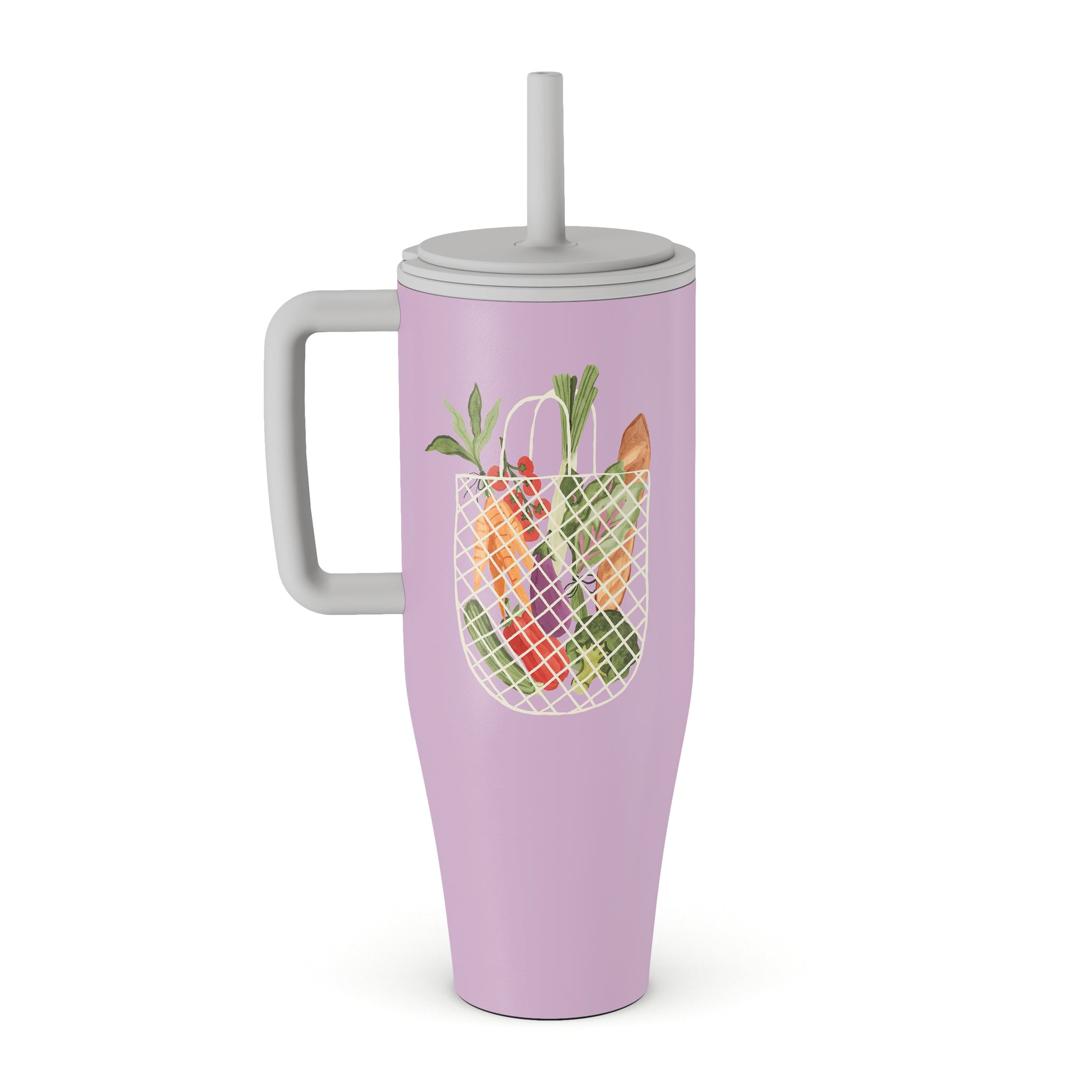 This design features: vegetables, market bag, colorful food illustration