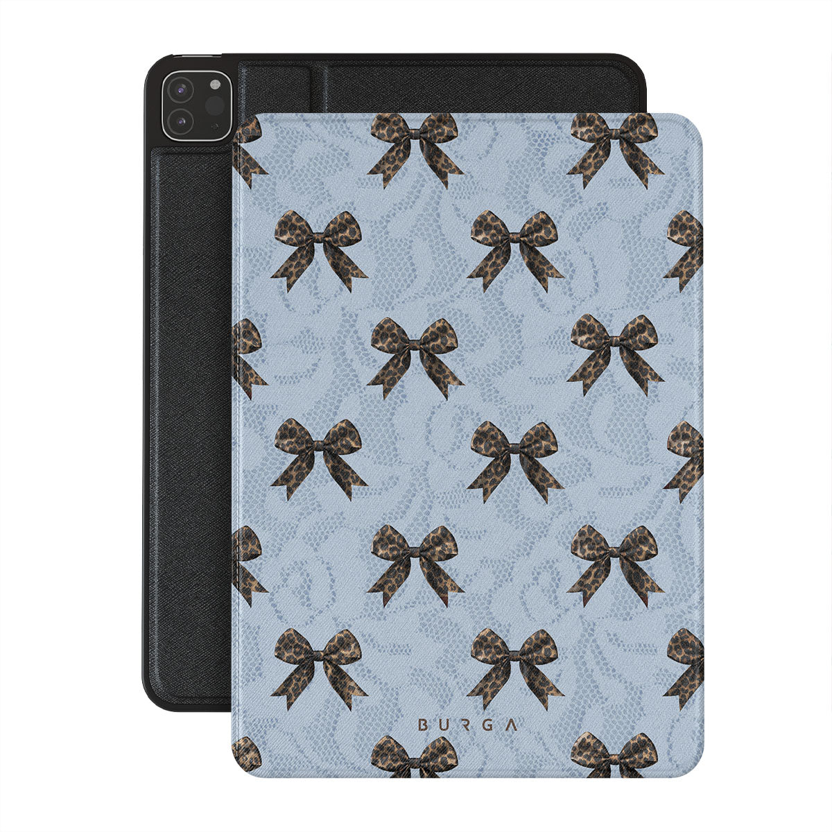 For those who command attention with subtle elegance, our Fashionista iPad Pro 12.9 (4th/3rd Gen) folio case design is your go-to. A soft blue background, accented by dark grey bows and subtle lace patterns, exudes polished, effortless style. It's quiet confidence with a hint of charm.