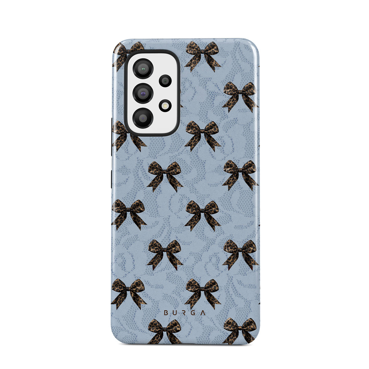 For those who command attention with subtle elegance, our Fashionista Samsung Galaxy A33 phone case design is your go-to. A soft blue background, accented by dark grey bows and subtle lace patterns, exudes polished, effortless style. It's quiet confidence with a hint of charm.