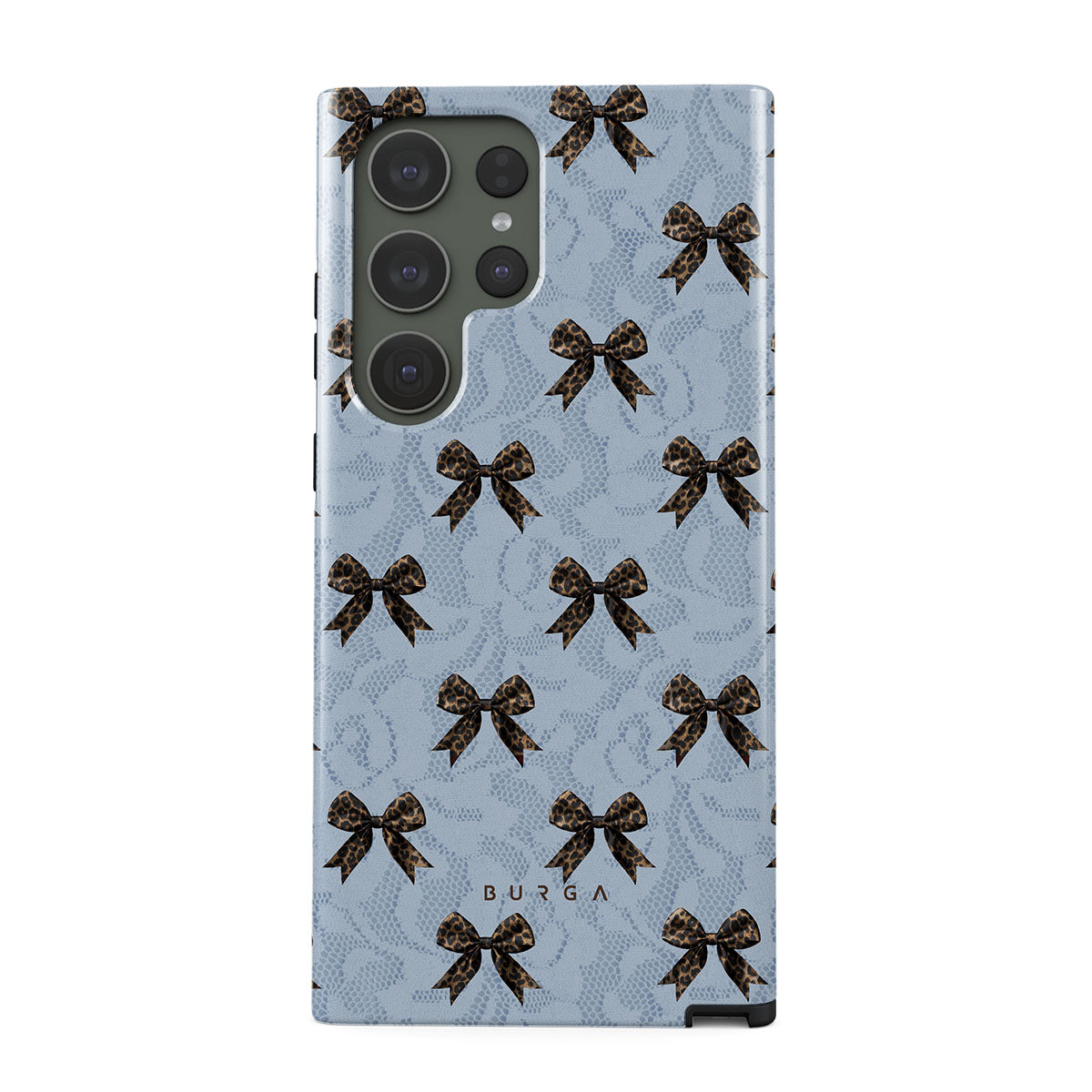 For those who command attention with subtle elegance, our Fashionista Samsung Galaxy S23 Ultra phone case design is your go-to. A soft blue background, accented by dark grey bows and subtle lace patterns, exudes polished, effortless style. It's quiet confidence with a hint of charm.