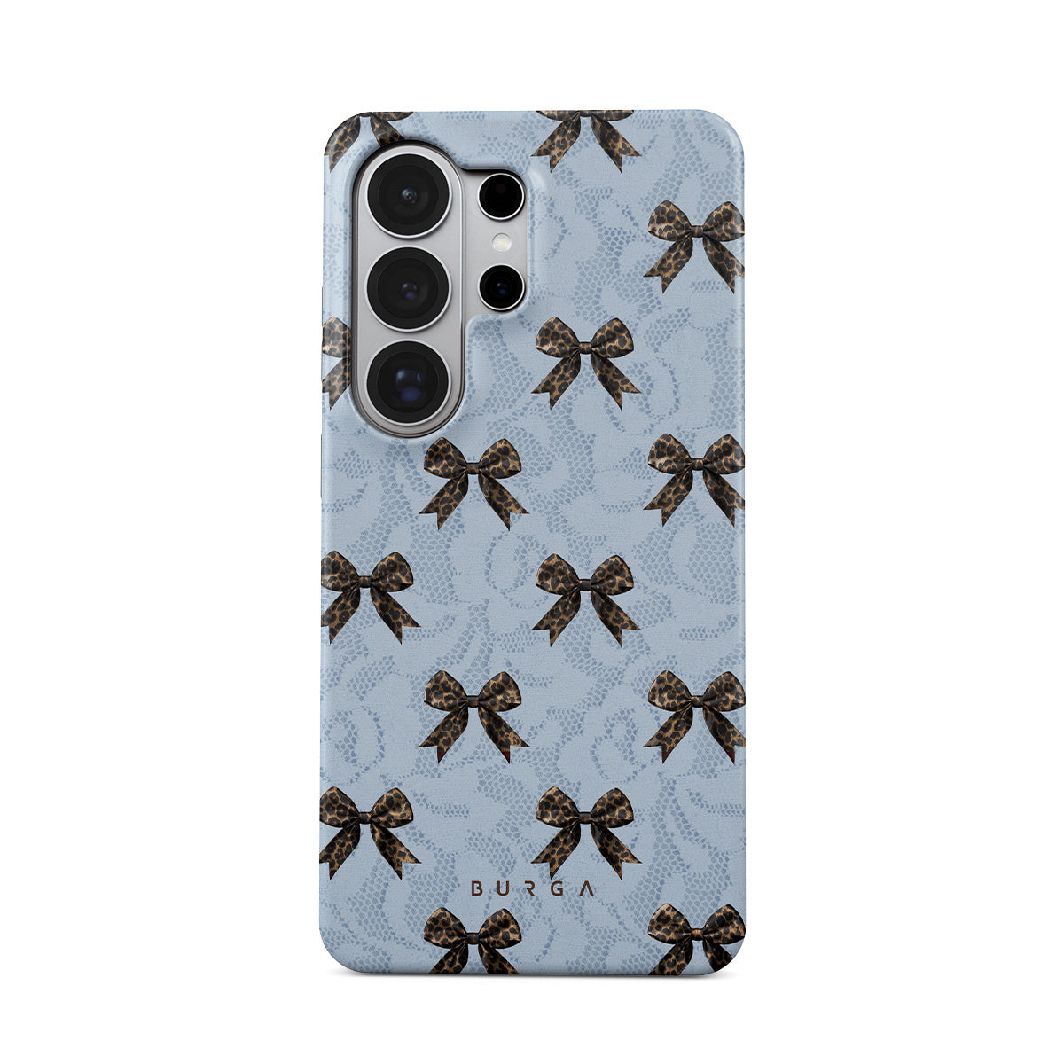 For those who command attention with subtle elegance, our Fashionista Samsung Galaxy S26 Ultra phone case design is your go-to. A soft blue background, accented by dark grey bows and subtle lace patterns, exudes polished, effortless style. It's quiet confidence with a hint of charm.