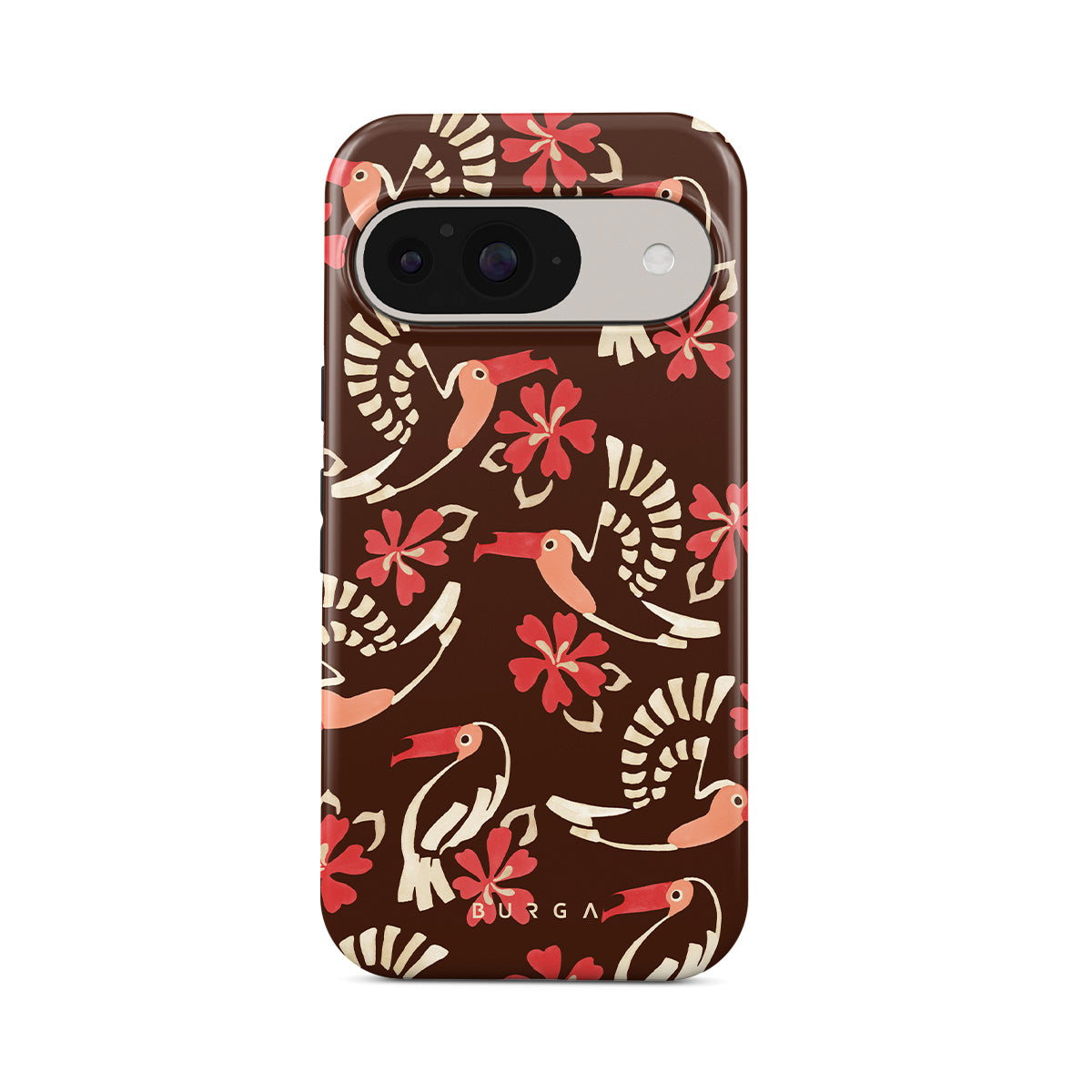 A jungle rave. Parrots, florals, bursts of red and cream—like someone threw a party in the rainforest and forgot to send you the invite. This Google Pixel 10 phone case design is your RSVP.