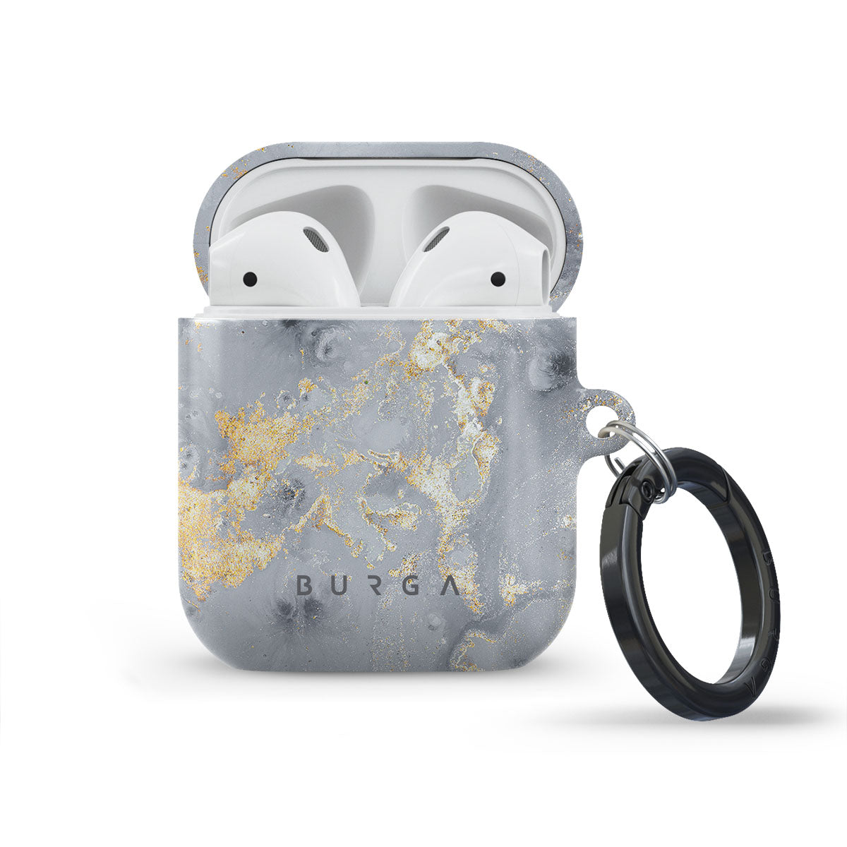 The soft gray color scheme with the golden specks creates an Apple Airpod Generation 1 & 2 case cover that radiates sophistication. The unique design is inspired by nature and frost. Now you can keep the cool touch of winter in a design that will look good at any time of the year. Our case fits perfectly snug around Apple Airpod Generation 1 & 2 . “Like a glove!” one might say. And it won’t disrupt the wireless charging capabilities of the newer model. There’s even an LED light indicator to prove it (don’t worry, wired charging still works, too). When fitted, the BURGA case will protect the delicate Apple Airpod Generation 1 & 2 case beneath it from scratches, bumps, and drops while remaining scratch-free itself. Our signature design pattern prints are High Quality, and will never peel or fade away- thanks to our unique printing technology. And finally, a handy carabiner is there to make your life easier and more convenient: just snap it around your keys or belt loop and tackle the day head-on. Your music is right there by your side when you need it.