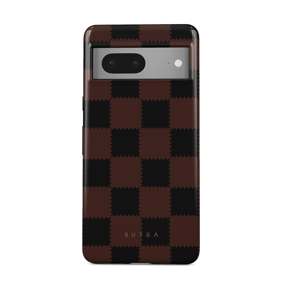 This design features: checkered pattern, brown and dark tones, geometric