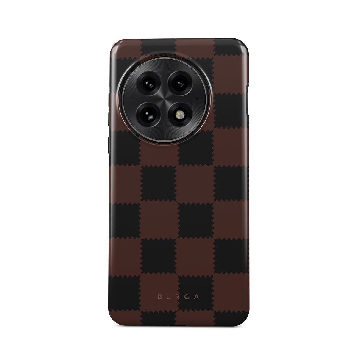 This design features: checkered pattern, brown and dark tones, geometric