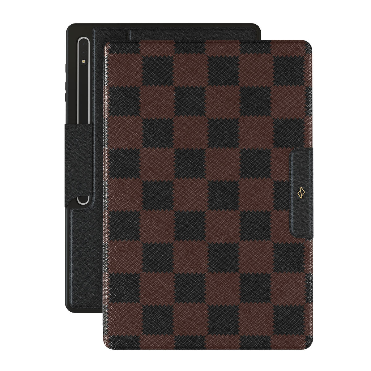This design features: checkered pattern, brown and dark tones, geometric