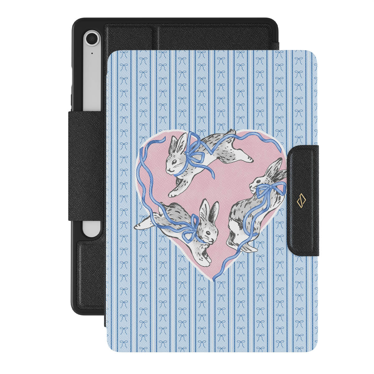 This design features: white rabbits, heart frame, blue stripes