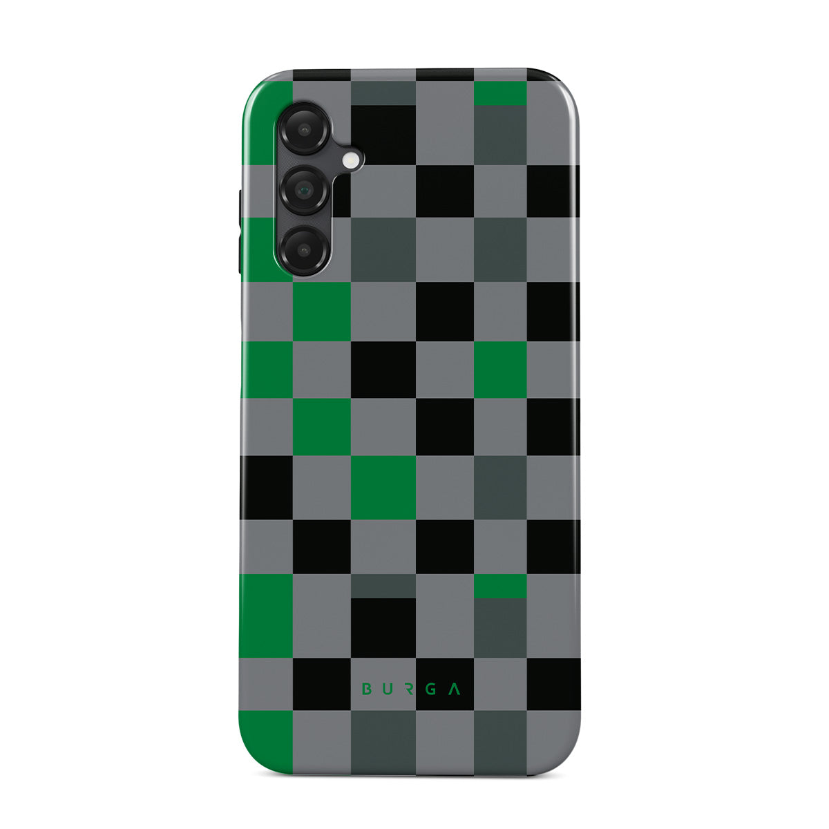 This design features: checkered pattern, green, gray, and black, geometric