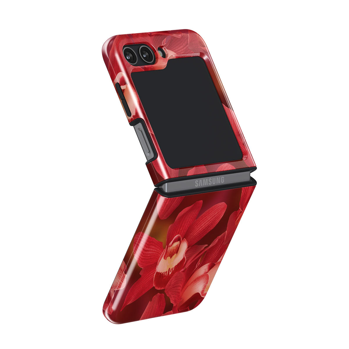 The deep red orchids emerge with a passionate intensity, evoking the fervor and depth of emotions that come with fully experiencing life. They are a vibrant call to embrace every heartbeat, to live deeply and love boldly. Discover the Goddess Energy Samsung Galaxy Z Flip 5 phone case design.