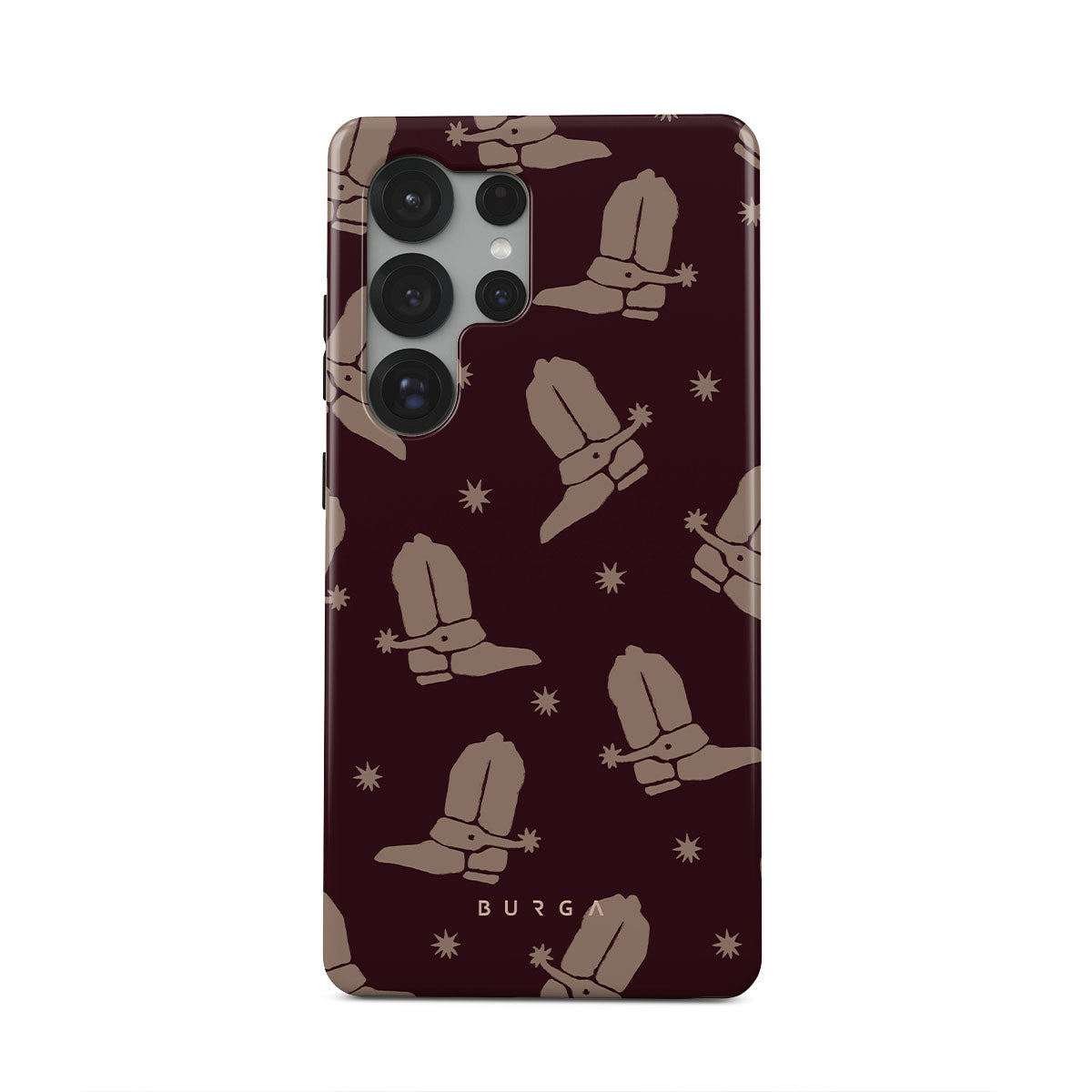 Say Howdy to this charming Samsung Galaxy S25 Ultra phone case design. Cowboy boots and stars dance across a deep brown background, celebrating the essence of western life. Perfect for those who embrace their free spirit.