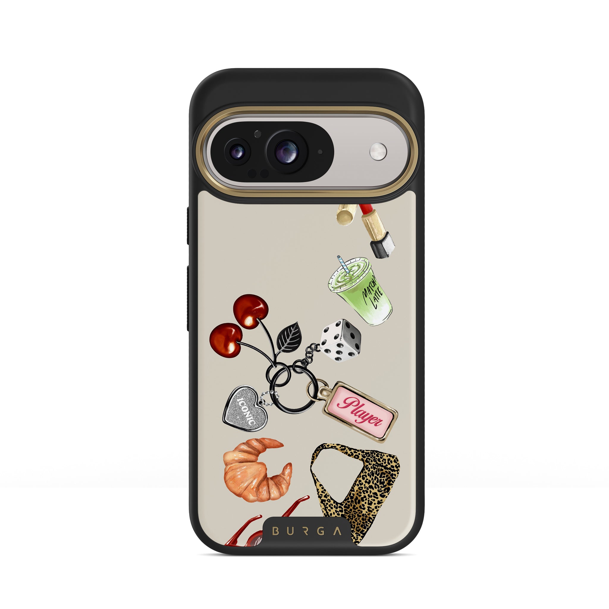 This design features: red sunglasses, red lipstick, green matcha drink, croissant, black dice, leopard-print bag, keychain with silver heart, cherries, dice and "Player" tag