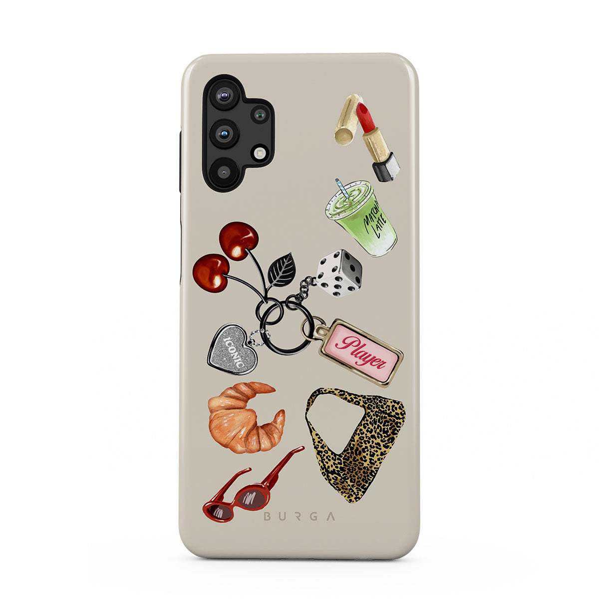 This design features: red sunglasses, red lipstick, green matcha drink, croissant, black dice, leopard-print bag, keychain with silver heart, cherries, dice and "Player" tag
