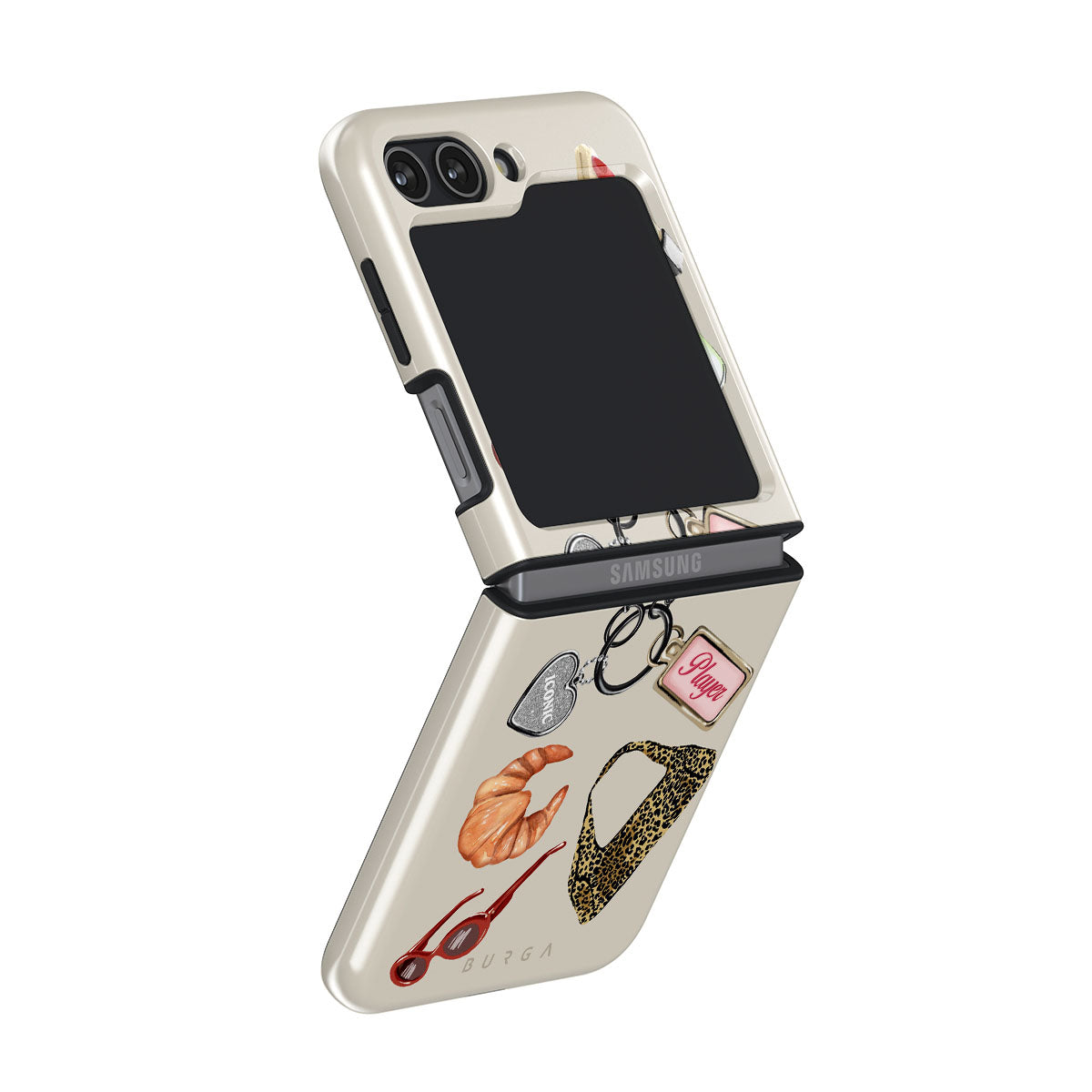 This design features: red sunglasses, red lipstick, green matcha drink, croissant, black dice, leopard-print bag, keychain with silver heart, cherries, dice and "Player" tag