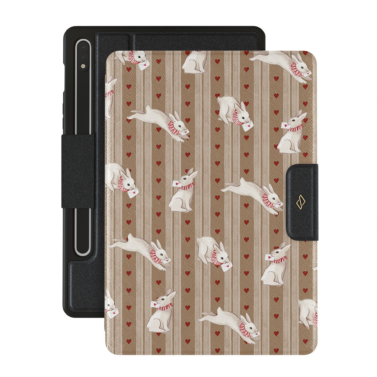 The Late Again Samsung Galaxy Tab S8/S7 folio case design is a love letter lost in time—scattered hearts, hurried notes, and white rabbits racing against a clock that refuses to be tamed. Sent, but never received. Read, but never answered. Always running, always chasing, always just a moment too late.