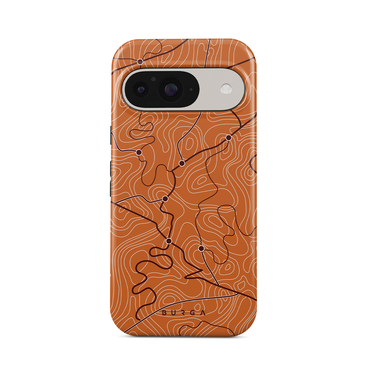 This design features: orange, map lines, abstract pattern