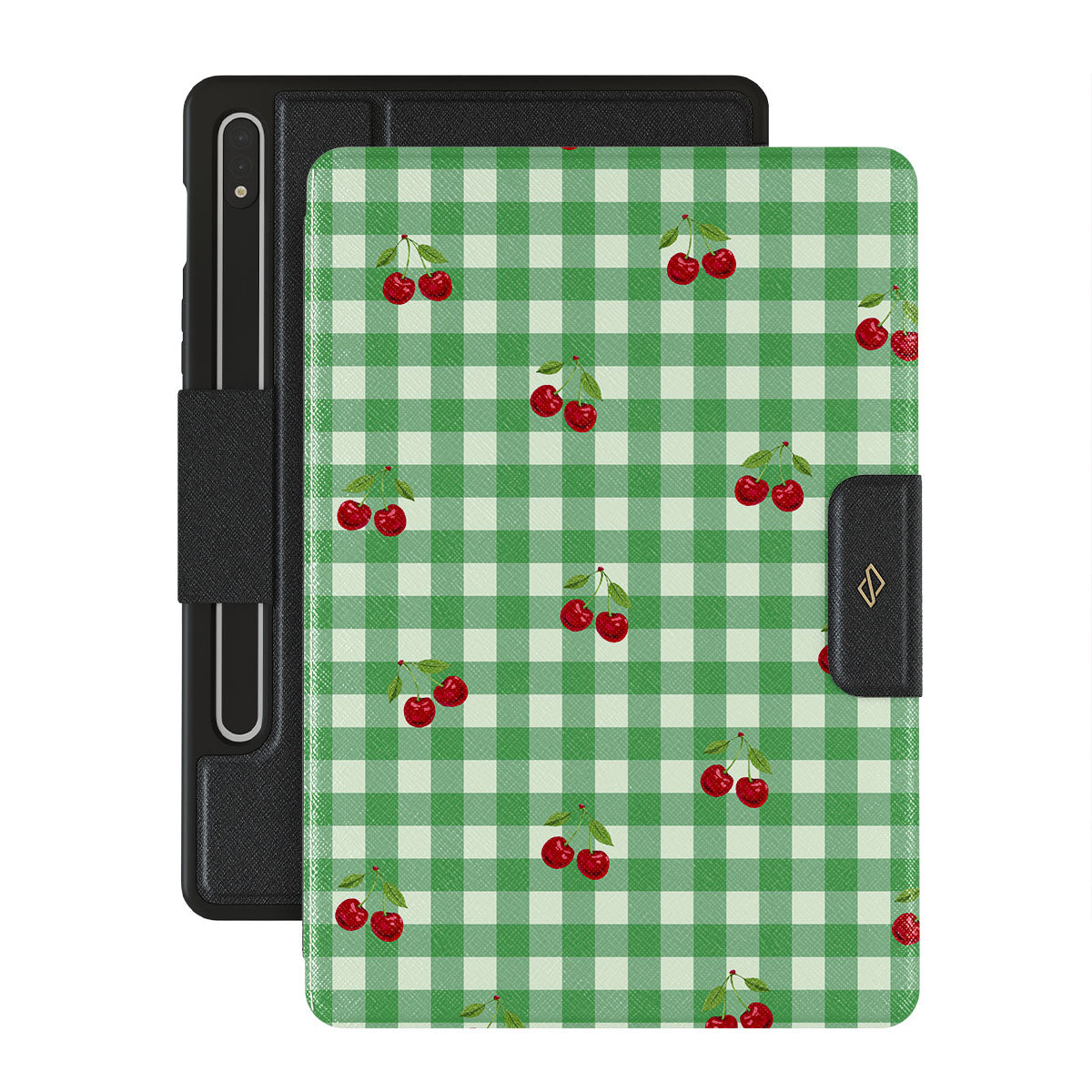 The Little Life Samsung Galaxy Tab S9+ FE folio case design: green checks, simple and true, like a patch of grass under a tree, where you can sit and watch the small world go by, every leaf a chapter in nature’s story.