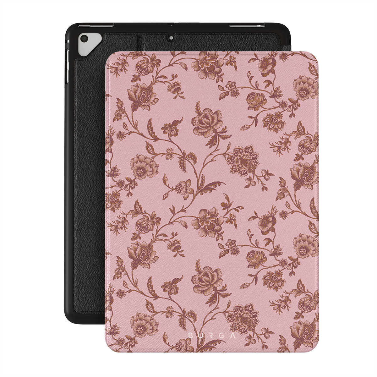 The Lover iPad 9.7 (6th/5th Gen) folio case design: because you're a Lover, not a fighter. Delicate floral motifs across a soft pink background capture the essence of timeless beauty and rustic elegance. Perfect for modern-day cowgirls with a vintage heart.