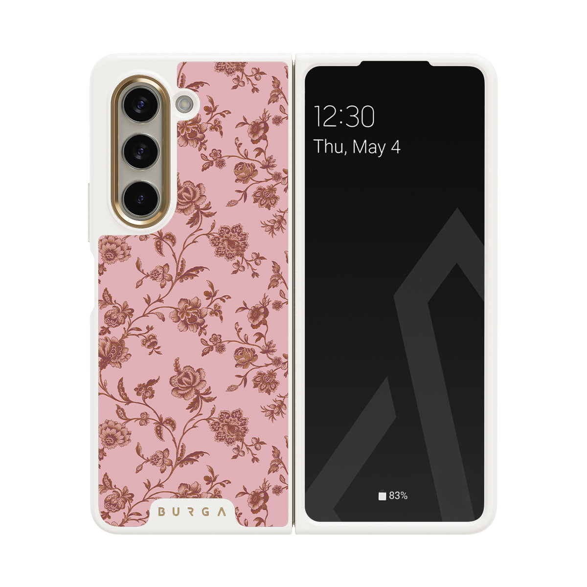 The Lover Samsung Galaxy Z Fold 5 phone case design: because you're a Lover, not a fighter. Delicate floral motifs across a soft pink background capture the essence of timeless beauty and rustic elegance. Perfect for modern-day cowgirls with a vintage heart.