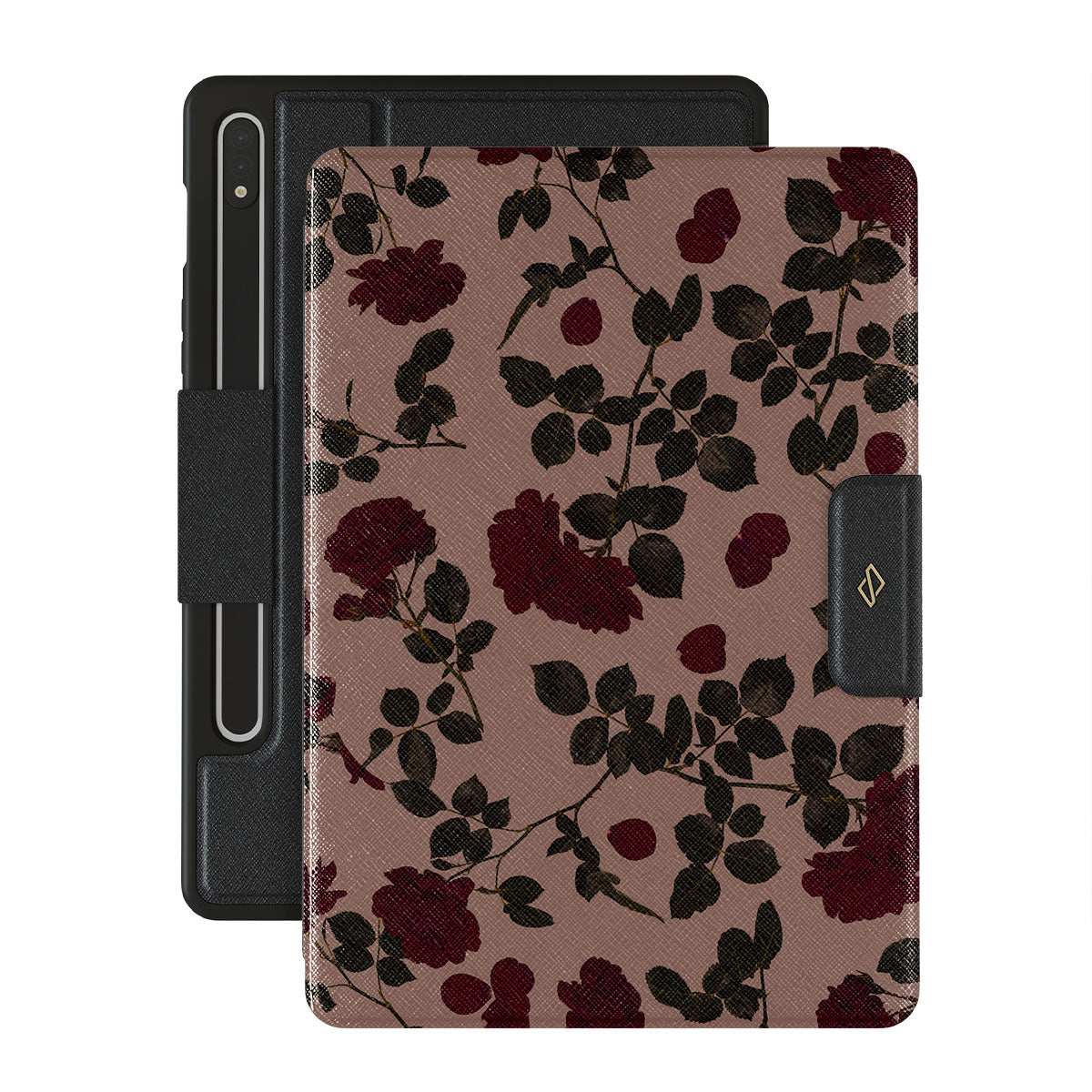 Live out loud as the Main Character with this elegantly bold design that promises a new daily adventure. With deep, rich roses against a pink background, this Samsung Galaxy Tab S9+ FE folio case design is crafted for the muse in you.