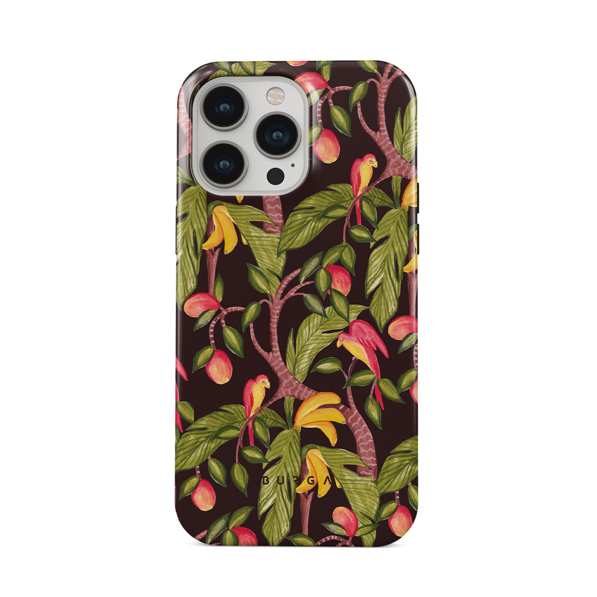 A lush botanical fantasy where ripe mangoes hang like forbidden fruit. Deep greens and juicy oranges pull you into a tropical escape. If this iPhone 13 Pro Max phone case design had a voice, it would purr.