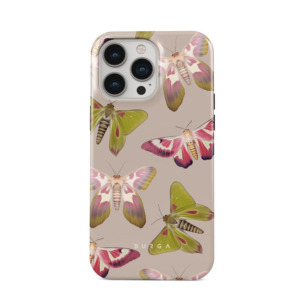 A tapestry of muted-toned moths — their wing patterns echoing tales of transformation and resilience found in nature's delicate beings. These moths, wings wide, serve as silent mentors, teaching us that every phase of life and change holds its own magic and mystery. Discover our Metamorphosis iPhone 14 Pro Max phone casedesign.