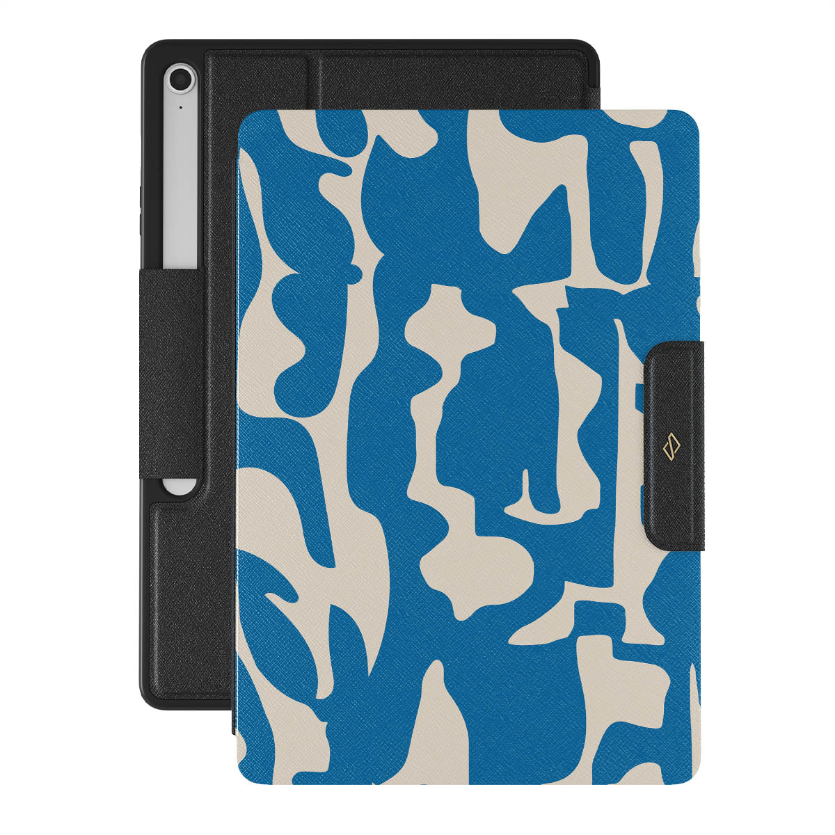 Indulge in the exquisite elegance of Mirage. Against a canvas of deep, enigmatic blue, luminous shapes gracefully disrupt the darkness, creating a captivating visual spectacle. Let this Samsung Galaxy Tab S10+ FE folio case be a symbol of your impeccable taste and magnetic charm.