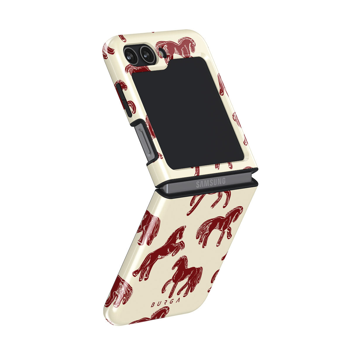 It's time to unleash your wild side with the Mustang design. Bold red horses gallop across a nude background, capturing the spirit of untamed adventure. This Samsung Galaxy Z Flip 5 phone case is perfect for the free-spirited souls ready to ride into the unknown.