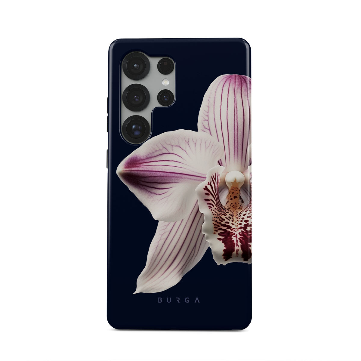 The white orchid blooms boldly upon a night sky blue, a beacon of clarity in the darkness. Our Nectar Samsung Galaxy S25 Ultra phone case design speaks to the soul's desire to find light within, to illuminate the hidden paths of self-discovery that only reveal themselves under the cloak of introspection.