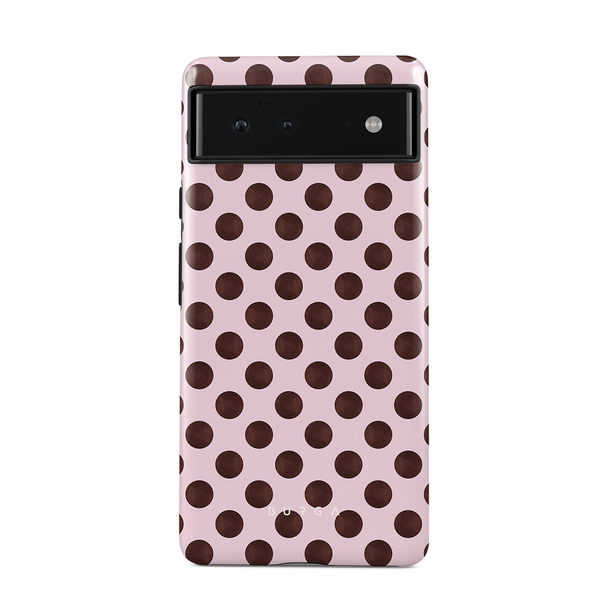 This design features: a retro polka dot pattern, pink background with brown polka dots.