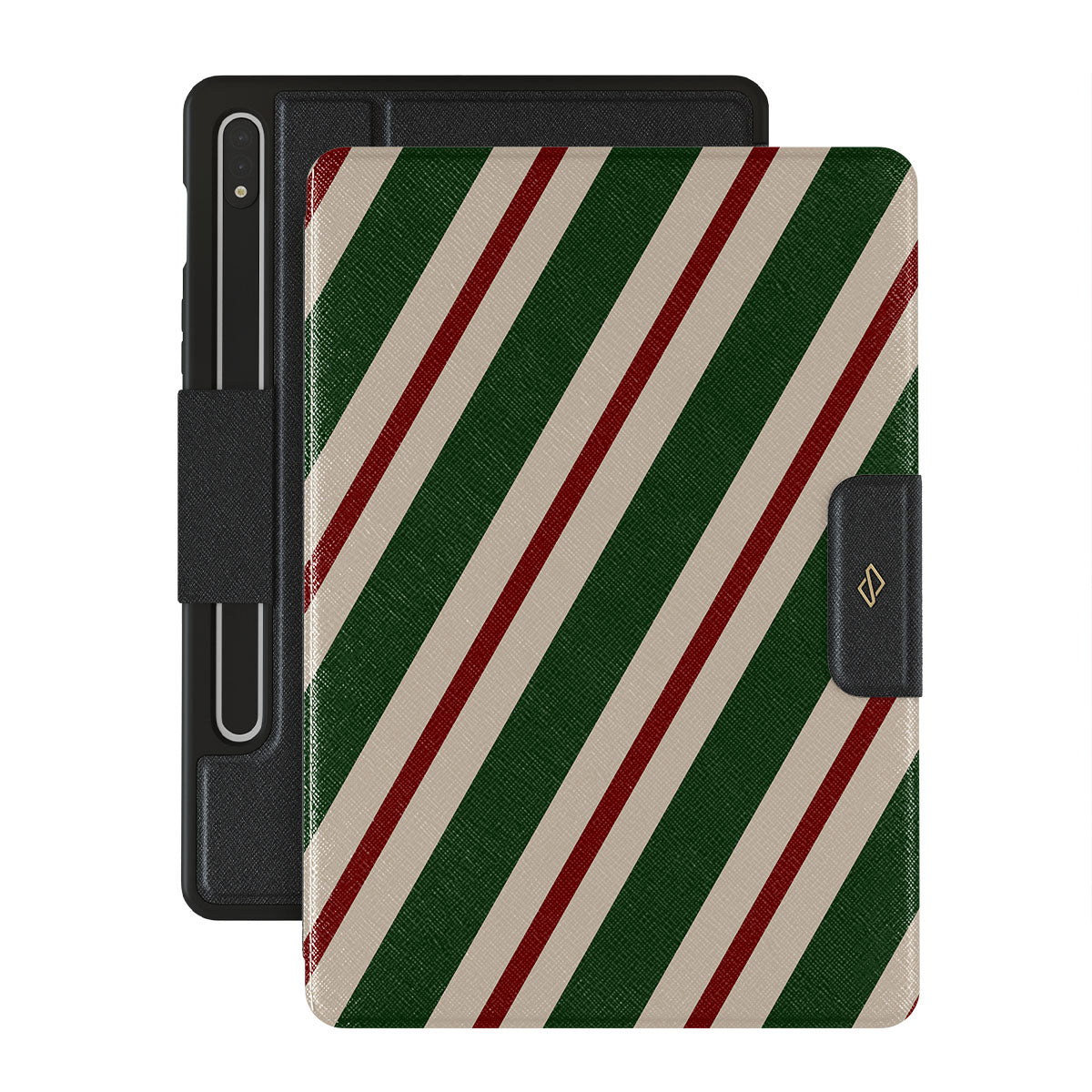 A joyful design that screams holiday spirit. Our North Pole Samsung Galaxy Tab S9 FE folio case transports you straight to Santa's workshop. Bold green, red, and white stripes echo the joy and laughter of elves preparing for the festive season.